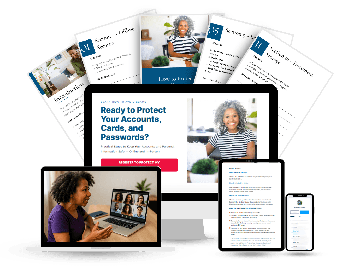 The live workshop will not be recorded; however, you’ll receive “How to Protect Your Accounts, Cards and Passwords” Video Guide — the complete step-by-step training where I go inside each platform and show you exactly how to put the workshop lessons into action.